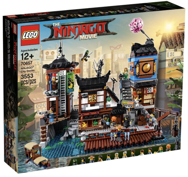 New & in Sealed Box Have fun with Lloyd, Cole and friends at THE LEGO® NINJAGO MOVIE™ 70657 NINJAGO® City Docks and defend against Garmadon’s attacks. This highly detailed set features a harbor with a functioning crane and boat, and 2 levels of Old World locations including a grocery store with tipping food display and rotating rotisserie; house with map room and kitchen/bedroom; sculptor's workshop; plus a dojo. Experience modern NINJAGO City life on The Street with a tearoom and an arcade with interchangeable billboards, buildable arcade games, functioning vending machine and a buildable pig ‘balloon’ attached to the roof. This set also includes 13 LEGO NINJAGO minifigures. Includes 13 LEGO® NINJAGO® minifigures: Lloyd, Cole (in casual outfit), Garmadon, Private Puffer, Runje, Chan Kong-Sang, Runme, Runde, Dareth, Lil’ Nelson, Mystake, Chad and Betsy (with a baby figure). Features a modular design for easy play, including a harbor, Old World (lower level), Old World (upper level) and The Street. Harbor features brick-built water; boathouse with a boat for a minifigure with an opening roof, oar and secret compartment with 2 collectible NINJAGO® ‘cards'; dock with functioning crane; removable barrels containing assorted elements; and an opening cave. Old World (lower level) features: a grocery store with tipping food display and rotating rotisserie; alleyway; and a sculptor’s workshop with a buildable statue and statue elements. Old World (upper level) features Runde the explorer and Mystake's house, and Dareth's dojo. House features a map room with assorted elements including a globe, sextant and a book with a collectible Atlantis ‘card' inside; sliding doors; kitchen/bedroom with buildable oven, sink, bunk beds with removable top bunk, and assorted elements including a TV; and a roof with attachment points for 2 minifigures. Dojo features 4 katanas, 4 shurikens, weapon racks and assorted elements including a Sensei Chen tournament leaflet, 3 trophies and exterior wall with scroll. The Street features the explorer and Mystake's tearoom, arcade with billboards, and a newspaper stand with 3 NINJAGO® News elements. Tearoom features a service counter, opening entrance door, scales, teapot, cup and 2 NINJAGO® News elements. Arcade features 2 buildable arcade games, a buildable candy machine, interchangeable billboards, functioning vending machine with money bill and 3 soda can elements, and a buildable pig ‘balloon' attached to the roof. Weapons include the Green Ninja Lloyd's sword, Garmadon's 4 katanas and Private Puffer's fish chainsaw. Accessory elements include Cole's mobile phone, Runje's fishing rod, Chan Kong-Sang’s money bill, Runme’s hammer and chisel, Lil’ Nelson’s arm cast, Chad’s cup and Betsy’s baby bottle. Connect to 70620 NINJAGO® City for endless ninja adventures. This cool toy for kids measures over 14” (37cm) high, 14” (38cm) wide and 9” (25cm) deep