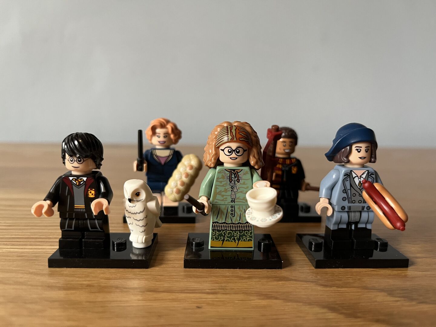 Set of five Harry Potter minifigures: Harry Potter with Hedwig owl (missing wand), Professor Trelawney with teacup and wand, Tina Goldstein with hotdog (missing wand), Queenie Goldstein with bread and wand, Dean Thomas with flag and wand